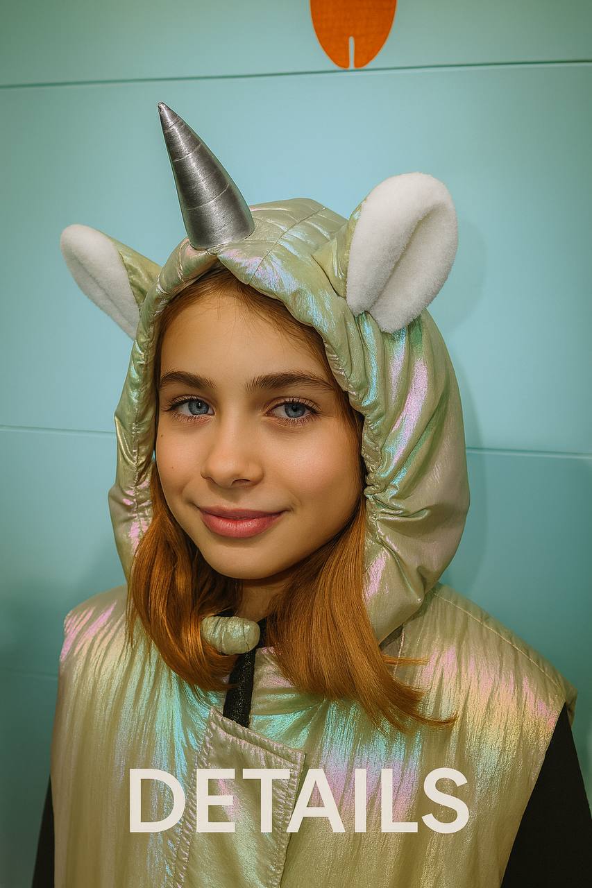 - Без рукавов + капюшон с ушками и рогом: удобно поверх свитеров и толстой кофты.